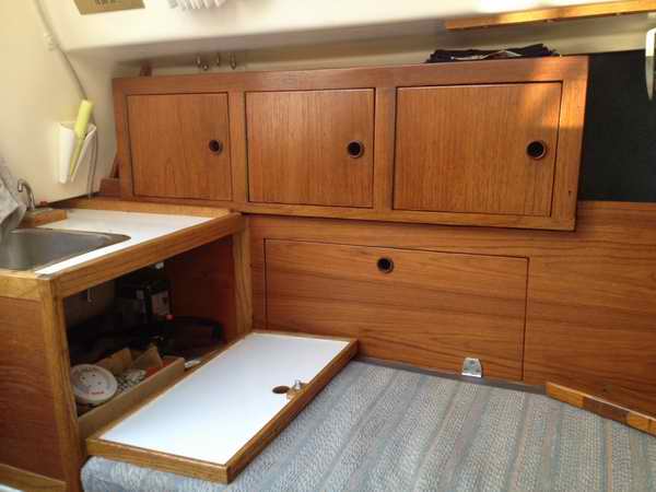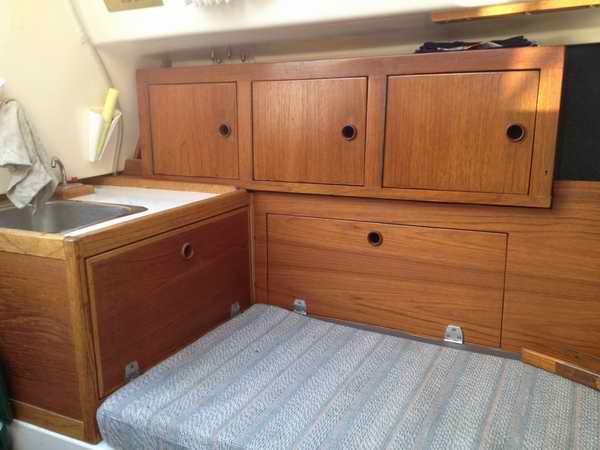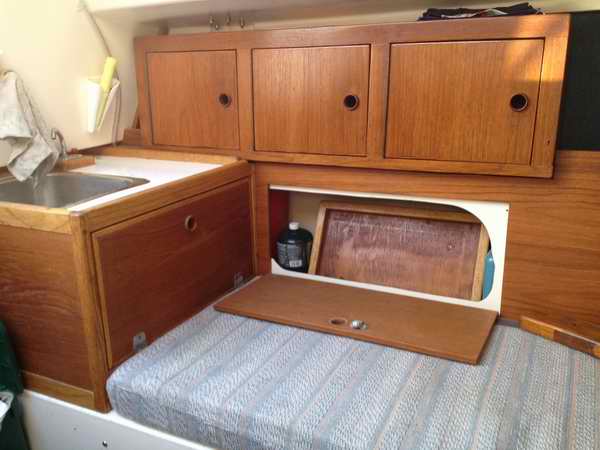 galley couldn't be found, so the second owner built a custom teak counter with sink over the aft half of the port berth, matching the upper cabinets.