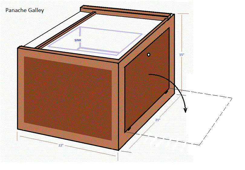 Panache's galley takes up only 2' of the aft end of the port berth, leaving the remaining 6' 6" clear for all but the tallest crew. This galley is essentially a "wood box" constructed with a 3/4" red oak frame with 1/2" teak plywood sides set into the rabbet joints of the frame. I built the "box" extremely strong so I can stand on the corner straddling the companionway to work the mainsheet or the deck mounted line lockers; something I occasionally do in lumpy water because it's a secure place to stand. The galley is bolted to the settee with several 1/4" SS bolts and large SS washers below. The flip down door can lay flat on the cushion (see photos above), doubling as extra counter space. It is equipped with low fiddles to keep the cushion clean. The inside of the door and the counter are both covered with white melamine for a water proof finish that is easy to wash clean.