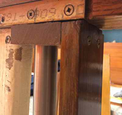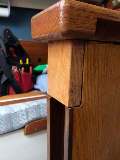toe rail leak. This was a lot of work but turned out to be easier than trimming the downturned flange of the head liner above the back of the cabinet. Fortunately I was able to