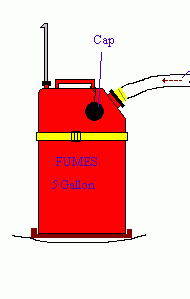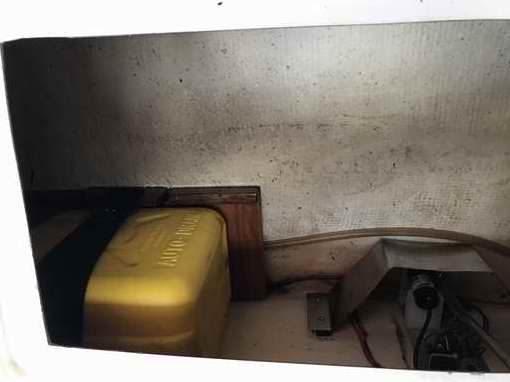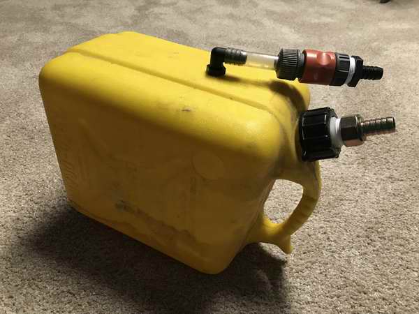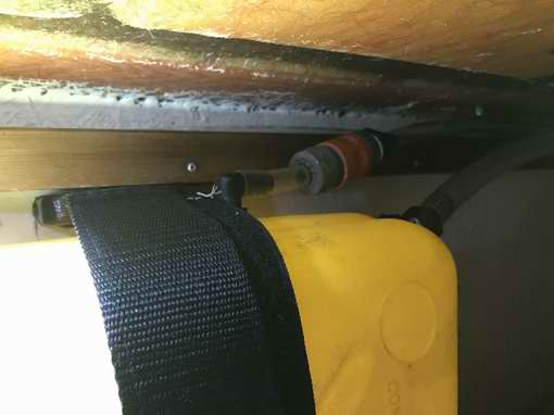 INSTALLATION on PANACHE - The installation on Panache uses a 10L gas jug resting on a (16 x 8)" wood shelf under the port settee. The shelf is equipped with a full length foot at the low side to raise it to horizontal over the sloped hull. It has a fiddle on the outboard side to keep the jug on the shelf. And finally it is saturated in epoxy to protect the wood. The gas jug rests on its narrow side for minimal fluid slosh and is secured with a 2" wide Velcro strap to ensure it stays put during a 600 heel. With the top mounted fittings released from the hoses the full jug can be slid aft and lifted out the settee hole without spilling a drop. Any spillage after first use will determine if a catch tray is required.