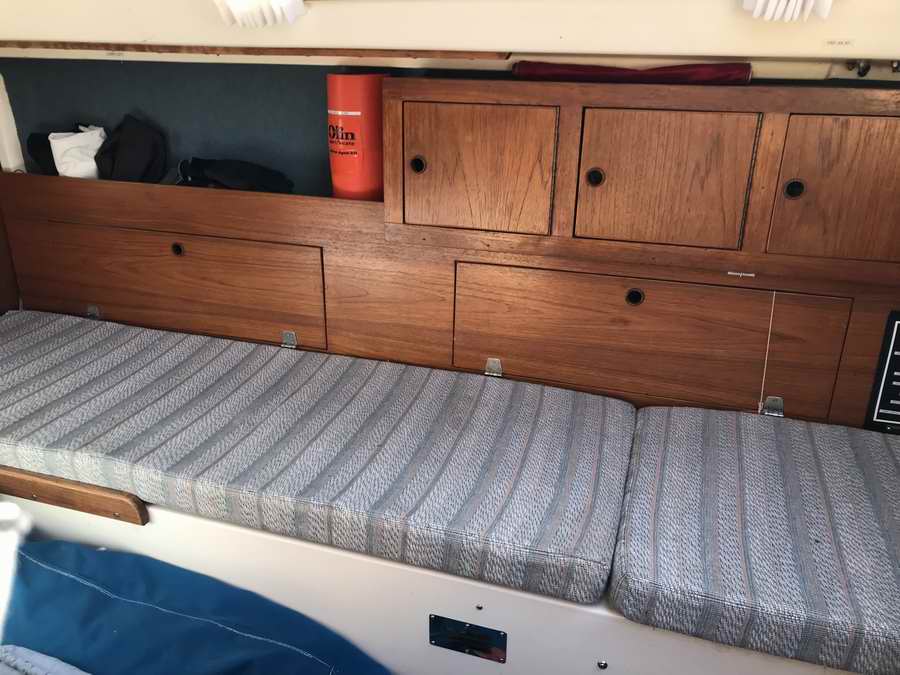Starboard settee cushion split at the 2/3 point and still comfortable to sleep on.