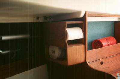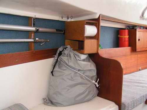 bulkhead that stores a small fire extinguisher, mosquito trap and other sundry items.