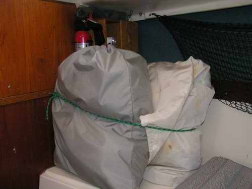 The bug screen for the forward hatch now lies on the narrow shelf.