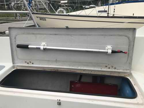 This is a pretty clever way to store a telescopic mooring pole. Right where you need it most of the time. Yup that is Panache in the background and yes you can still learn something from another boat. TOP