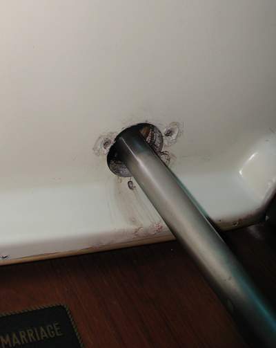 with epoxy and inserts a fitting to eliminate chafe. Seal this hole for water leaks after the hose is