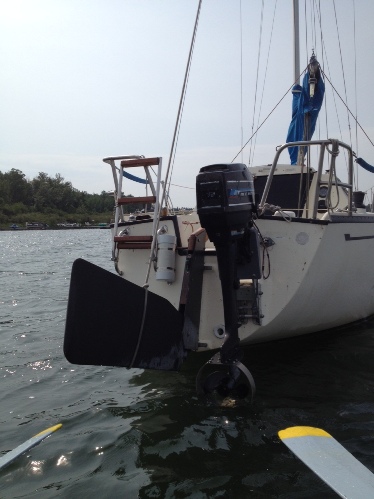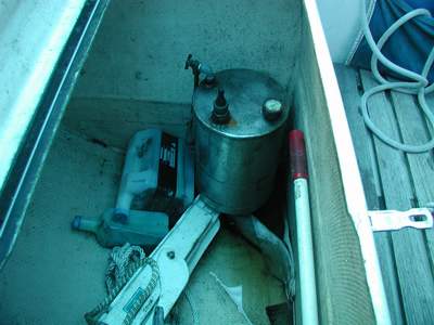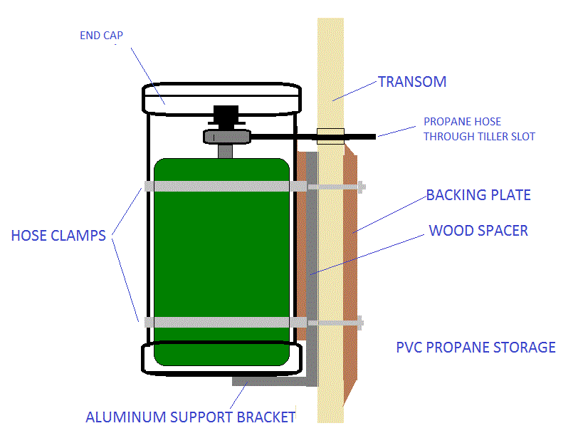 propane hose leads out of the locker, through the tiller slot to a hole at the back of the