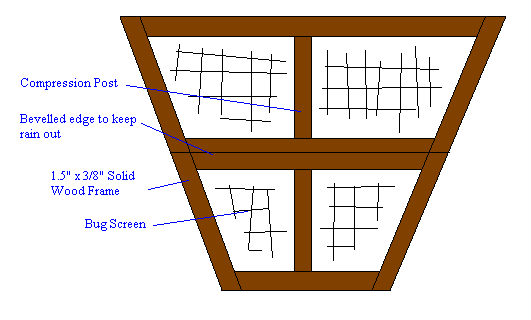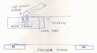 I built two wood framed bug screens, the same size and thickness as the existing drop boards, so they fit snug inside the drop board tracks for quick deployment. This way I can interchange them with the top or bottom Plexiglas drop boards to deal with most any weather or privacy situation. The photo at right was taken during winter storage before I built the squirrel proof winter storage version of it. The frame is constructed of (3/8 x 1.5)" hard wood. It really doesn't matter which type of wood you choose but since it's only 3/8" thick, make sure there are no knots. Glue the joints for strength and coat the wood with your favourite stuff to protect it from the weather. Make sure to coat the inside of the groove to prevent rot. I used tung oil because it is easy to recoat in low temperature. It is also tough and doesn't blister in the sun. After the tung oil is dry, its time to stretch the screen over the frame.