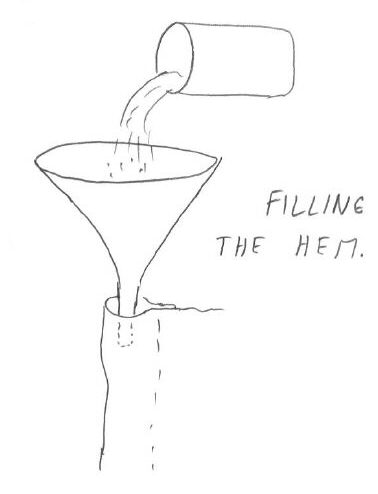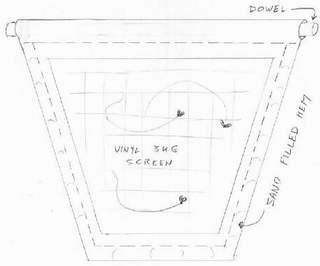 Sew a 1.5" wide hem of Sunbrella all around the screen. Fill the bottom hem with sand or lead pellets to the density of a bean bag to keep the sand from shifting to one end. If you overfill the hem it will become too stiff for folding. Fill the side hems with flexible foam that can be jammed into the grove to create a seal. Insert a dowel through the top hem to hang the screen in the companionway. The weight of the sand should keep the screen in place and hence, the "skeeters" out. Rolling the screen up is probably the best way to store it. |