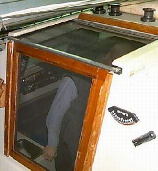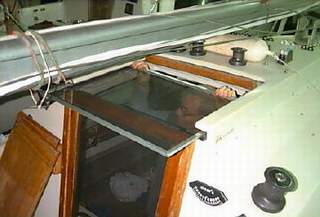 the middle of the night. Shown here is an excellent one piece wood framed screen that fits snug in the companionway. The owner also has a top screen for extra ventilation since it can pass a terrific amount of heat, which is something to consider on a hot sticky night. If you think it might rain overnight then pull a tarp over the boom before you go to bed. The top screen is framed in aluminum to fit in the narrower sliding hatch track. This is a Mirage 27 that incorporates an acrylic slider into a storm hood. The screen was made by a local glass shop that specializes in window repair. It's actually not difficult to make yourself as the parts are available in many home repair depots.
