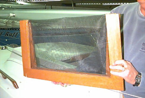 At right is another variation on a bug screen. This person folds it for compact storage. The hinges are hidden on the inside to keep them out of the weather. He protects the screen from impact damage with a light rigid case.