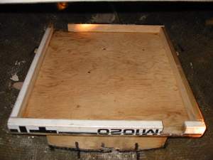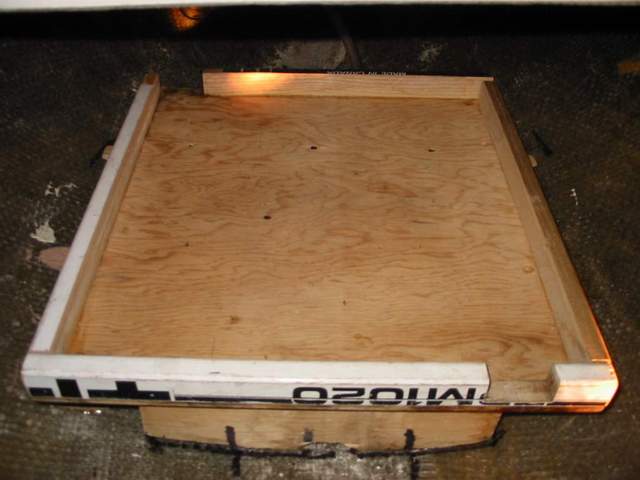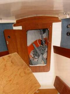 Shortly after I bought Panache I moved the fresh water tank from under the cockpit to the empty void under the forward berth because I needed the storage space under the cockpit for light bulky stuff. It seemed like the most logical place to put the tank. Later I discovered that the extra weight in the bow helps to offset the crew weight in the cockpit which makes for faster sailing, more responsive handling, higher pointing and less hunting at anchor. An SJ23 sails at its optimum while on its water line. Leave it to me to find a couple of technical reason for a nice practical solution! See Note 1. The rigid 10 Imperial gallon (45.5 L) rectangular tank is made of white polyethylene weighing 100 lbs (45 Kg) when full. It is translucent so in daylight it is fairly easy to see how full the tank is. While it just fits through the access hole in the forward berth, it was a hassle to pull out for end of season service as I always scraped my knuckles. Problem is, it is difficult to support the rectangular tank over the V shape of the hull and also keep it in place while heeled at 250 in pounding waves. My temporary supports usually collapsed with the rectangular tank resting at an odd angle, jamming into the V bottom of the hull and the underside of the berth. I doubt this was any good for the tank, the fittings, hoses, let alone the hull! The bow location has operational advantages, so I made a proper shelf to support the tank and sloped it aft so water could drain drip dry for winter storage. This has worked so well that the tank has never been removed since it was installed here in 1987. Fig 1 shows the tank installed. What is not shown are the long wedges of dense neoprene foam that I jamb between the top of the tank and the bottom of the berth to securely hold the assembly down, vibration free. CONSTRUCTION - To support the tank over the V shaped hull I fashioned a plywood shelf with two form fitted feet glued to the hull with Sikaflex. The shelf has never moved.