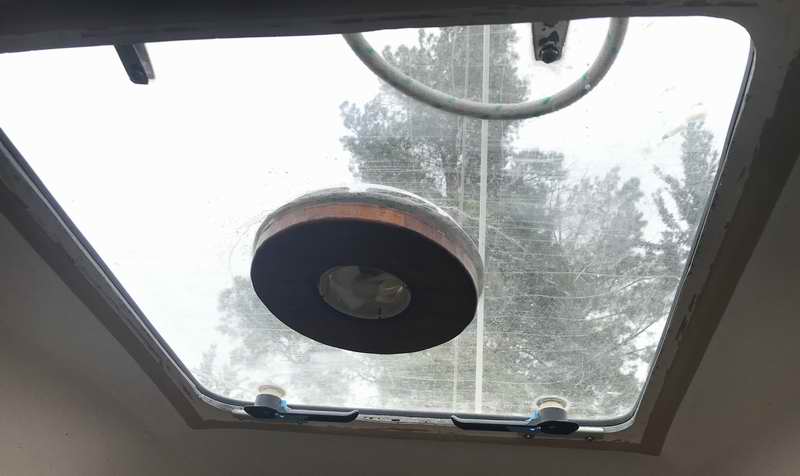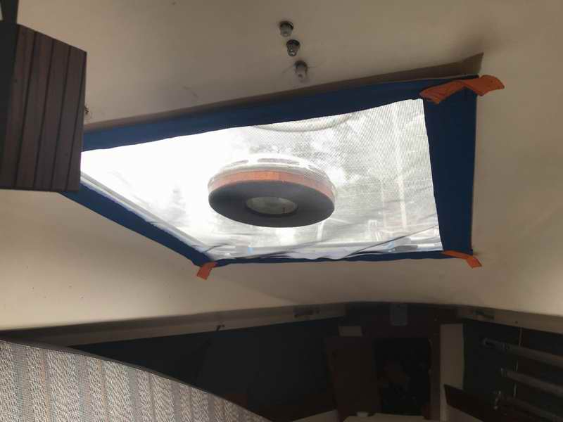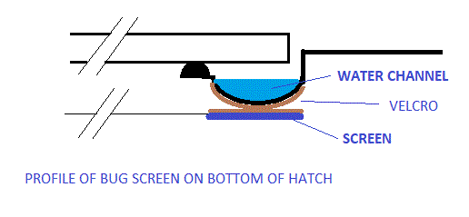 I have long wanted to replace Panache's forward hatch bug screen as it has seen better days years ago. I curse it every time I sleep onboard and try to stick the screen to the Velcro under the hatch. The problem is that it was stored folded for a very long time and developed permanent creases in the screen. Those creases eventually cracked, creating a highway for bugs to zoom through. And boy do they find me. This is the primary reason why the replacement screen will be rolled up for storage. It will be stuck to the underside of the hatch to keep me away from the bugs while they stay on their side. One thing is for certain, anything that keeps those #$%^& skeeters out is a OK to me. DESIGN The new design has to be quick to set in place or release for escape during an emergency. Always keep the emergency escape thingy in mind! The screen will have a border of Sunbrella to protect the mesh and to which the Velcro will be sewn. The ceiling Velcro will be stuck to the bottom of the convex water channel that surrounds the opening. To deploy it, the screen will be rolled out along the underside of the SJ23 hatch, mating Velcro to Velcro. Geeze I hope that water channel never fills to that depth! OTHER DESIGNS