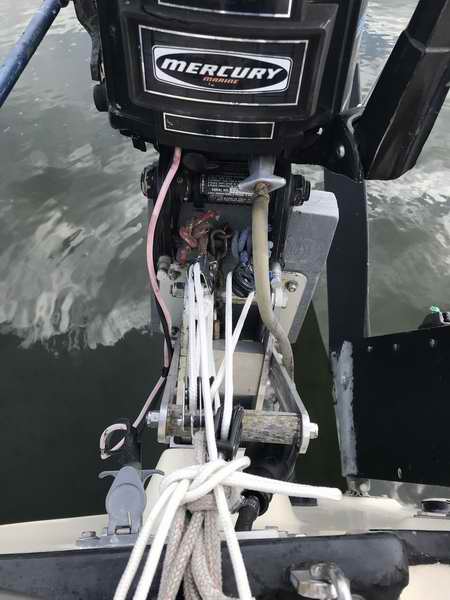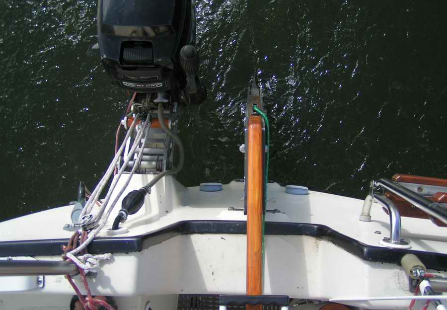 I am so glad that Panache has electric start and a gear shift extender (not shown below) that goes up over the transom. One of these days I'll figure out how to extend the START and STOP switches into the cockpit as well.