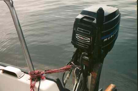 There is an additional benefit to this arrangement. When the locking cam on my original outboard mount was worn it sometimes had a nasty habit of releasing. The resulting crash sounded like it would rip the transom off. To prevent this I pulled the free end of the lift line around the pushpit leg then tied it around the block and tackle with a slip knot. This locked the outboard securely in the raised position. I still use this method today when the boat is in her slip.