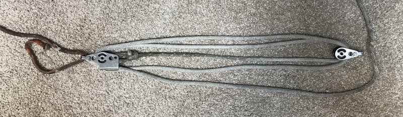 6:1 Block-n-Tackle (2024) - I changed the lift line block and tackle from 4:1 to 6:1 to overcome the initial resistance of lifting the outboard. Triple blocks would have been nice but are difficult to source in this small size. They are also difficult to fit within the tight confines of the outboard up in the sailing position. By adding two single blocks beside the existing dual blocks the assembly fits nicely. The new installation at right incorporates 1/4" line. |