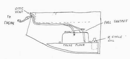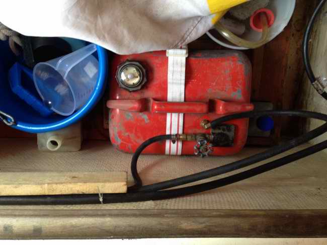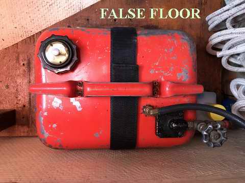 my 2.5 US gal fuel tank shown here and secured it to the false floor with a 2" wide Velcro strap. This strap is far easier and quicker to fasten than the buckle shown above having a pull tab on the end. I also added an inline fuel filter (just out of camera view). When I have to extend my motoring range I