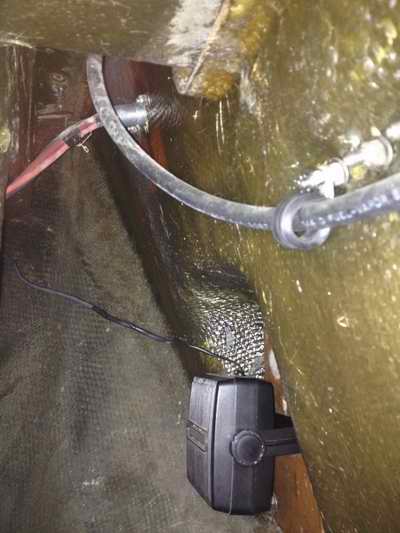the top gudgeon bolts as shown at left. This trough and the hoses in it