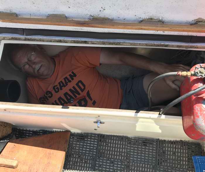 ![]() A - Frank this is an incredibly lousy job. You WILL get dirty, especially with glass fibres coming off the inside of the hull. So wear coveralls to protect your skin and clothes and a surgical mask to prevent breathing the air borne fibres. Tighten the cuffs and collar. It helps to be slender, loose 30 pounds quickly or find that skinny friend who owes you a favour. Torquing these screws in the factory was done by a skinny little kid (Steve) who was kept around only because he could fit into those small far reaching places, armed with a 7/16" box end wrench. They also used him to access things in the anchor locker. DOING THE "COCKPIT CRAWL" to TIGHTEN BRACKET NUTS - The following instructions apply for those early SJ23 hulls where the cockpit drain tubes go down through the hull. Its relatively easy to crawl back there with a clear floor. But if your drain tubes go through the transom (later version hulls) you could crawl over the horizontal tubes with a wood bridge or temporarily remove the drain tubes. Failing either of these suggestions, install an inspection plate in the aft end of the cockpit wall. See Tech Tip B36.