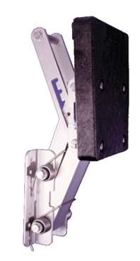 SALT WATER BRACKET (2004) - Many current salt water rated outboard brackets are more robust and rated for a higher horse power. They are also equipped with an internal gas spring that provide lift which makes them an attractive upgrade for a silver haired sailor! Present company excepted! The OMC outboard bracket (shown below) is an example of such a unit. It is rated for up to15 HP and has an internal gas spring that makes raising or lowering a 'piece of cake.' The pivot arms are spaced far apart to eliminate sideways movement. Unfortunately, if you don't replace like for like, the mounting bolt holes of the new wider brackets don't line up to the original holes on an SJ23. The narrow outboard mounting "pod" on the transom of an SJ23 makes upgrading to the new wider outboard bracket difficult. The SJ23 pod was sized for the narrow foot of the original style Fulton bracket. The foot print of all the current brackets are much larger. It should be noted that Fulton MB1820 now has a good design (shown at right) for a pocket cruising sailboat. It is quite an improvement over the early design shown above in that it is more rigid and has all stainless steel parts. I think this is an early design of the MB1810 saltwater bracket that is rated up to 30 HP 2-stroke or 6 HP 4-stroke, max 130 lbs. The 3" wide formed pivot arms are effective at eliminating sideways play and the mounting plates line up to the mounting holes through the SJ23 transom pod. This improved design is what prompted me to stiffen Panache's bracket. Another good stainless bracket with no sideways movement is the Garelick model 71056. However, it requires an adapter plate to mount on an SJ23.