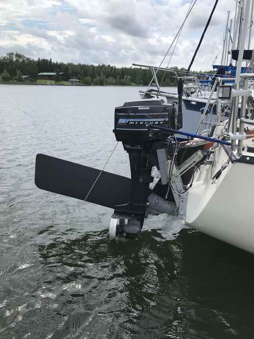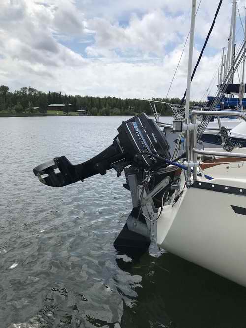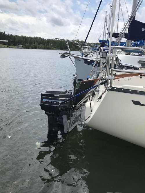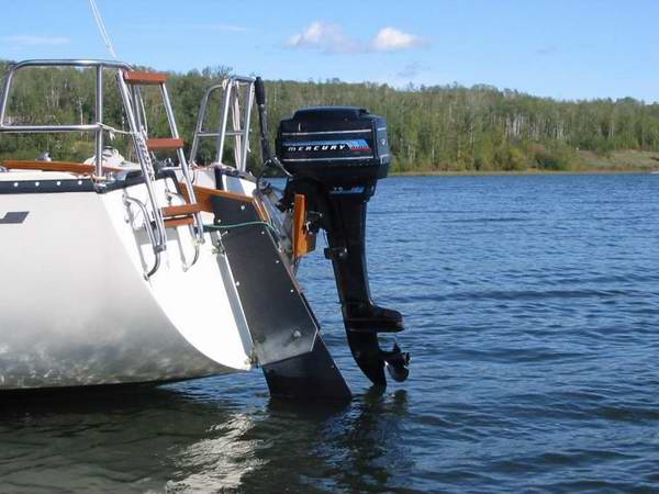 model. REPLY 5 - I have a brand new 2 cycle 4HP Mercury on my SJ24. The boat will do hull speed at about 3/4 throttle. The gas tank is self-contained with the outboard so no fuel tank or hoses to mess with. What more do you need? Mike Chaney, SV Pog Mo Thoin. REPLY 6 - I have used a Honda 7.5HP and other 6HP outboards on various SJ23s on Puget Sound. They all work fine. More HP means more weight and more weight means less performance under sail. The SJ23 has a finite hull speed and overdriving the hull burns more fuel, with not much more speed. Gene Adams. REPLY 7 - I use a 7.5HP long shaft Mercury equipped with electric start and generator. The center of the prop is 27" down from the top of the transom and it usually runs about 12" deep. It performs very well in lake sailing and achieves about 5 knots in flat water at 1/3 throttle. If I throttle up, it makes a lot of noise and burns a lot of fuel without going much faster. In really rough water I once tried punching to weather in 4' peaky waves at 4 knots with 1/2 throttle. However, the hull took a lot of pounding, the rigging took a lot of shock loading and my teeth did a lot of chattering. Therefore I now "tack" into the waves to smoothen the ride for the hull and rigging plus reduce the load on the outboard. This has the advantage of increasing the speed through the water and reducing fuel consumption. While I like the outboard, a four stroke (quieter, lower fuel consumption & higher thrust) with top mounted controls would be nice. When I added the duct around the propeller it reduced the fuel consumption by ~40% at 5 knots. One day I may replace the standard two blade propeller for a three blade to improve the reverse thrust. This outboard is such a sweet combination that I doubt I will ever replace it. Bob Schimmel, SV Panache. REPLY 8 - We had an outboard failure last summer while trying to leave the dock so we rented the marina's outboard to complete our haul out. Unfortunately it was a short shaft of 8-9HP. I can't remember the make, not a Johnson or Honda, maybe Nissan. We mounted it as low as possible and moved all of our gear aft, sat on the stern and almost went crazy trying to keep the water pickup under water while we motored to the travel crane dock. From this experience I would never consider buying a short shaft. Our outboard bracket has the hydraulic lift assist and tilt features to make life easier and we never leave any part of the outboard in salt water except when under power. Betsy Schultz. REPLY 9 - If you've read the past posts and you've run into mine that tout the Honda 7.5-10HP family of outboards, please forgive. There is everything to love about this series except lifting them onto the engine bracket, as they weigh a bit over 80 lbs. Beyond that, you get reliability, relatively quiet operation, and hull speed at a little over 1/2 throttle. When you need to push hard into a headwind, there is still reserve thrust available. Then there is the added benefit of having a charging system for the house batteries. |