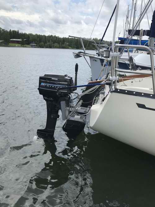 If you have to replace your outboard then consider the environmentally friendly choice and buy a four-cycle outboard. The lower fuel consumption, emissions and quieter operation are not to be discounted. They burn cleaner, with more thrust, and are therefore more reliable than their 2-stroke equivalent. On the other hand, fuel injected 2 stroke outboards are at the same efficiencies and low pollution of a 2 stroke (2015). If you continue to use your older 2 stroke outboard then use Amsoil synthetic two-stroke oil (or equivalent) to keep your spark plugs clean and reduce your oil pollution by at least 50% over mineral oil. Amsoil 2 stroke oil is mixed at 100:1 for an outboard that normally requires 50:1. I regularly mix the oil for Panache's Merc 7.5 at 150:1 with no detrimental effects. In fact this oil is so good that some snow mobile racers around here mix it at 250:1 for their Skidoos to go faster. Don't do this in an outboard though. All of us appreciate a clean environment. Just because sailors don't operate their outboard as long or burn as much fuel as a powerboat, doesn’t excuse you from polluting the water. Every one of us is part of the problem and part of the solution. OUTBOARD HORSE POWER - Be careful when making a HP comparison between an older and a newer outboard. The HP rating for an outboard changed in the mid 1980s. Some mechanics say it was around 1986 when the rating became universal for outboards since it was necessary to equate the thrust between propeller and jet drive units. The two had different power conversion factors. Prior to the change the HP of an outboard was rated at the power head and afterwards the HP was measured at the propeller. I believe this was also done as a more equitable means of comparing 2 & 4 cycle outboards, especially since the electric trolling motors are rated in thrust. In the final analysis who cares how much horse power the outboard has (except for a licensing issue). What you should care about is how much thrust the outboard produces and if the outboard is overloaded at that throttle setting. I'm sure this factor plays in the various opinions of SJ23 HP requirements listed below. Two other factors are up for consideration; weight and noise. 80 pounds should be the limit to hang an outboard on the transom and expect decent sailing performance. The other is noise, not to be discounted when motoring a long distance. 4 stroke are usually quieter than 2 stroke. I miss that about my Honda 4 stroke.