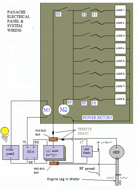 discharge meter, M2. Therefore the battery return wire is connected to (BB4-11), bypassing the shunt. This wire gauge is sufficient to drive the inverter to full output, continuously. - NEVER connect the AC neutral of an inverter to boat ground as this is hazardous. Leave it isolated. Panache's inverter draws power only from the battery. As such it cannot connect to shore power where it may create an unintended hazardous ground path or start electrolysis via the outboard leg (if left in the water). The electrical path combinations with shore power and adjacent boats is very complex and difficult to measure. NOTE 2 - The power from a modified sine wave inverter
