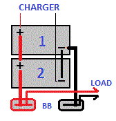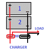 These 2 batteries are balanced since they each receive the same charge voltage. Expect slightly more stored charge than Fig 1 and an equal life for both batteries. This configuration requires the least hardware to wire and could also be wired as per Fig 3.