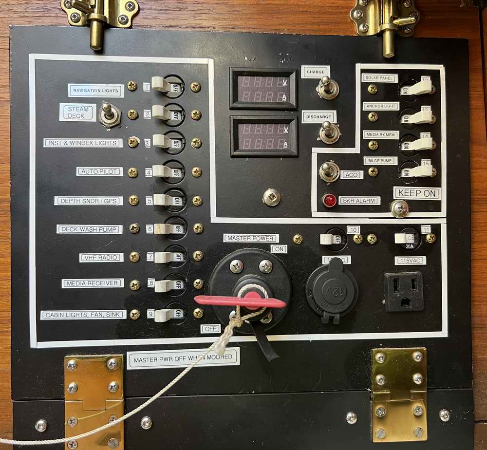 - Meter M2 - A 10A panel meter wired to measure discharge voltage & current to all loads except the inverter.