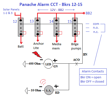 normally left ON. A breaker goes to alarm state when off. Alarm Circuit - The common contacts of the alarm contacts inside breakers 12-15 are daisy chained together (light black wire drawn through each breaker in diagram) to power a Sonalert (SA) and illuminate the LED if one of the breakers trips or is switched off (alarm condition). However,