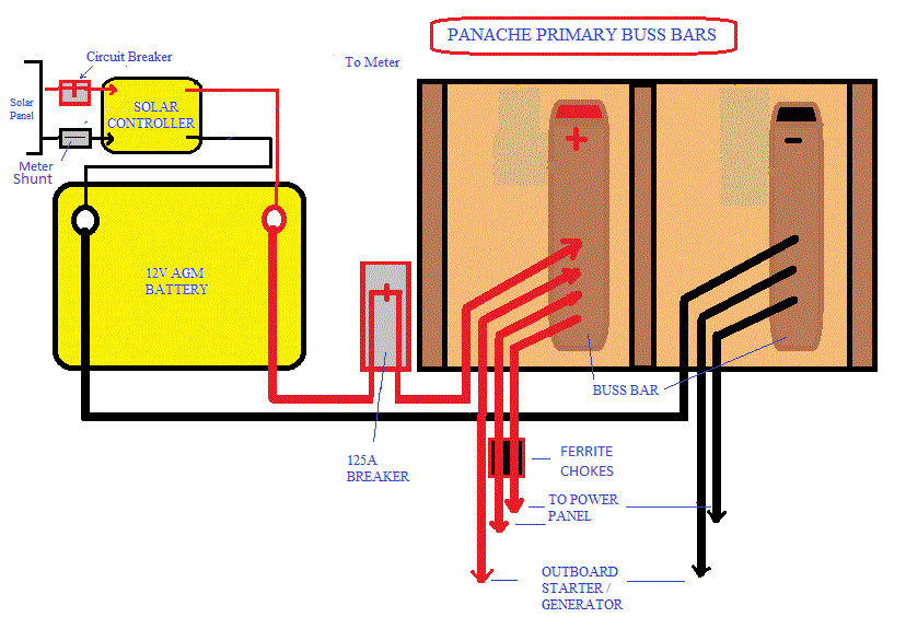 - The outboard starter / generator (6A) is connected directly to the primary buss bars (BB 0) so the starter can draw maximum power from the battery, bypassing the breaker panel. With the engine running, the generator automatically charges the battery through Bkr 0. So far I have not seen it necessary to install a breaker or fuse in this circuit for the following reasons: