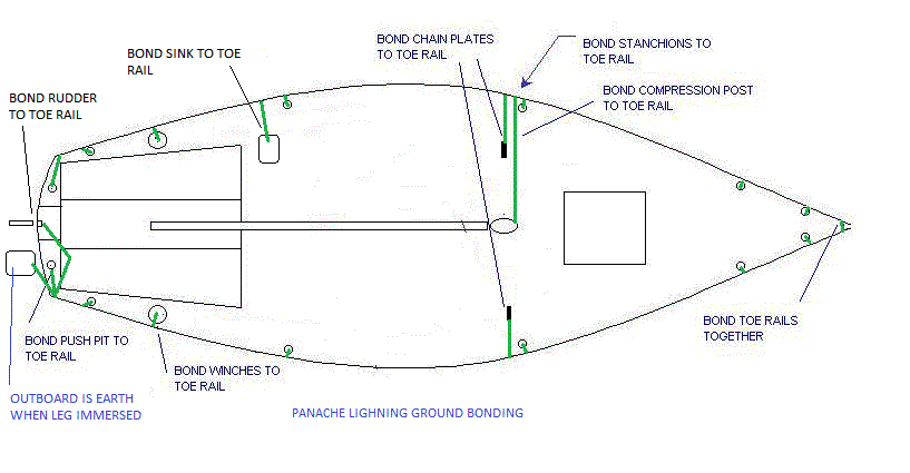 NOTE: "Please don't get the wrong idea about the information contained in this Tech Tip. There is no guarantee the wiring technique described here creates 100% effective lightning protection for an SJ23. The volatile and sporadic nature of lightning guarantees that it is difficult to develop a perfect cone of protection. In addition, testing an installed system is next to impossible and it may take a lot of trial and error to confirm it is effective. To further complicate things, what may be effective on one boat may be ineffective on another. While effective lightning protection systems on land are mature, on a boat this is still a trial and error process guided by best theory and practices. That is not to say that lightning protection on a boat is a hopeless endeavour, because it is getting better. Having said that, I doubt any "expert" will give you a written guarantee but every one of them