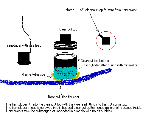 To begin with, you don't have to drill a hole through the hull to achieve good performance. If you are like me, I dislike having another hole through the hull just to measure the depth of the water. Another hole is simply another step closer to sinking a boat! I would rather heave a lead line than drill a hole through a perfectly good watertight hull. Consider what happens when the transducer packs it in, or worse yet, springs a leak, through itself? Well I guess you can always ask the scuba divers how deep the water is! So put your drill away, there is an easier method. What follows is the personal experience of several SJ23 sailors. But first some theory to help understand it. THEORY - A depth sounder uses a transducer to convert an electrical signal to an acoustic (ultrasonic) signal to transmit pulses through the water to the bottom. The pulses bounce back to the surface to be received by the transducer which converts them back to an electronic signal. The difference in time between a transmitted pulse and a received pulse is equivalent to the depth of the water. "There's math involved in knowing the propagation delay through the water and the electronics to measure it, but I'll spare you the details." In order to receive the very weak reflected pulses the transducer must be mechanically coupled to the water through a uniform high density material like fibreglass. The pulses are readily passed by a dense material like fibreglass and absorbed by a low density material like wood or foam in a cored hull. A high density material equates to low signal loss and low density material equates to high signal loss. Since a pulse can pass through the fibreglass hull, you don't "need" a hole through the hull. The location of choice for a transducer in a sailboat is forward of the keel, under the forward berth of an SJ23. In order to pass the pulses through the hull with the least signal loss, you must bond the transducer to the hull with no air bubbles between the two, otherwise you will receive a very strong echo from the bubble resulting in no depth reading displayed. The bonding technique is quite easy to install on a solid fibreglass or metal hull. There is an alternate technique to install a transducer on a wood or foam cored hull having multiple layers. Replace a small section of the core material, under the transducer, with solid epoxy to create a dense functional signal path. Fortunately the SJ23 has a solid hull and this is not required so I don't have to describe it! TRANSDUCER INSTALLATION - The key to a successful installation is to install the transducer out of the way where it can be serviced. The transducer and the wiring MUST be protected so an object can't slide against it to shear it off the hull. Now aren't you glad you didn't install it through the hull! The second point is to aim it vertical so the signal passes through the hull to measure the depth accurately when floating level. Compensating for an angle will be a lifelong frustration. The preferred location is under the forward berth just in front of the keel. This spot is a well protected, relatively easy to access and is the furthest forward for piloting your way through shallow water. It is the best you can do without having forward looking sonar. It is better to read the water depth ahead of the keel, than behind it! Here is a simple test to confirm a suitable location or to test the sensitivity of a transducer shooting through a hull.
