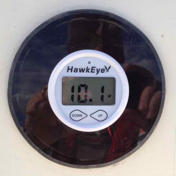 The epoxied transducer showed a constant reading while sailing all afternoon. This is far superior performance to the inconsistent readings with either of my liquid filled versions. At right is proof that shooting through the hull actually works. I've since found the deep holes and several mounds on the lake bottom that I had only heard of. This is a whole new way of navigating for me.