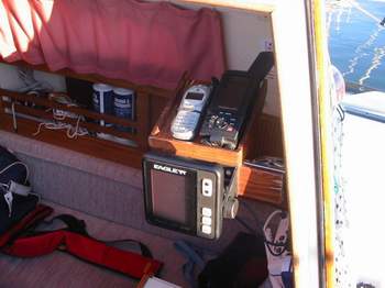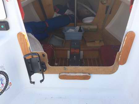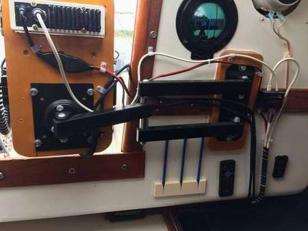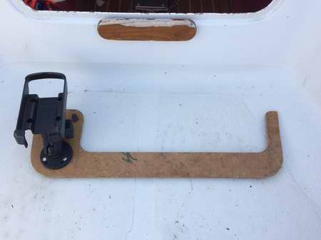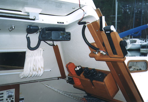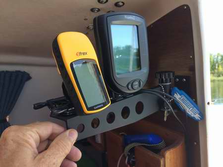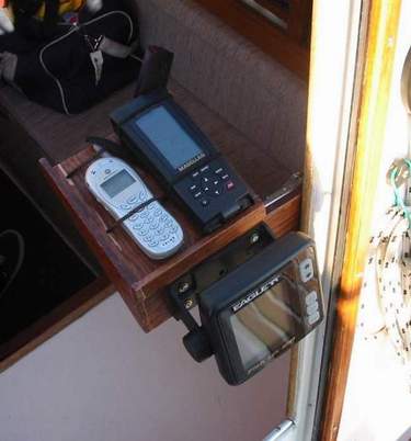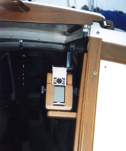 INSTRUMENTS ON A COMPANIONWAY DROP BOARD - A popular technique is to make an instrument board that fits snug in the bottom of the companionway. It can hold the chart plotter, compass, GPS, iPad or other instrument in a recess to protect it. It must not interfere with the operation of the mainsheet traveler installed in front of it. Use your existing drop board as a template for the instrument board and maintain the same thickness so it fits snug in the side grooves. The last thing you want is for it to pop out. By having it the same size as your existing board, you can leave it in place and add the top board if the weather should turn foul on you. Cover the back of the instruments with light plywood or other style of hard cap for foot and weather protection. If possible, build a storage box or cover that protects the face while the unit is stored down below.