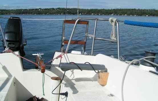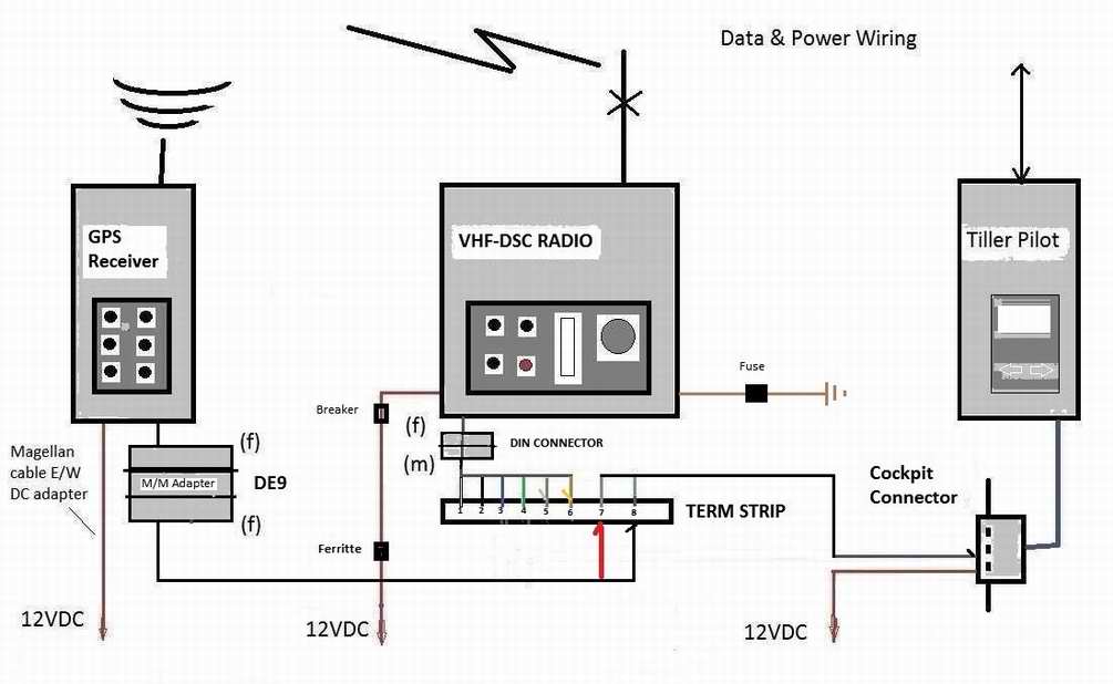 NOTE: In 2016 I installed a Standard Horizon Explorer GX1700 VHF-DSC radio. It is equipped with an internal GPS receiver that necessitated a change of the NMEA wiring I had with a Uniden VHF that died after only 2 years of use. The replacement Standard Horizon is much easier to operate. The amount of navigational data on some boats can be downright phenomenal, what with multiple programmable displays. Most manufactures of marine electronics sell a family of interconnected instruments that are designed to "talk" to each other for enhanced operation. This integrated operation generally requires a "data hub" with proprietary protocol to direct the data to/from each instrument, all with perfect signal quality for error free data transmission. The expense of this class of instrumentation is hardly feasible on the average SJ23 used for weekend sailing, but if you have deep pockets and want this degree of sophistication then by all means fill your boots. I still want some of the enhanced operation so opted for a simpler configuration, with the lowest possible power consumption. The correct data wiring is still required though, so don't go cheap by using the wrong cable. On Panache I have three navigational instruments; a Magellan GPS320 navigator, a Standard Horizon Explorer GX1700W VHF-DSC radio (Digital Selective Calling) and a Raymarine ST2000+ Tiller Pilot. I also have a Signet analogue knot meter, a Ritchie compass and a Hawkeye depth sounder but they don't count in my wiring scenario. I wired the three together for the enhanced features and convenience of operation. Given compatibility, these basic instruments can be swapped for other manufactures. "An autopilot equipped with NMEA tracking capability is a good choice for an SJ23. Being able to automatically follow a route programmed in a GPS navigator, not just a heading selected in the autopilot, will make life much easier for a solo sailor. This is especially true if you traverse a long stretch of cross current or side wind that will set you sideways to a dangerous area." Hal Mueller. THE CONCEPT - My idea was to hardwire the NMEA leads from my GPS navigator directly to my Tiller Pilot so it could follow a track as Hal suggests. The GPS receiver will source the following NMEA data sentences; Cross Track Error, Bearing to Waypoint, Distance to Waypoint, and Waypoint Number at 4800 baud async. I can view the GPS navigator screens to confirm I'm on track while cruising to a waypoint or along a route. Add an iPad with Navionics software and you have the overall picture. "A sailing buddy demonstrated a perfect use of this technology when he decided to motor back to his mooring after the midnight fireworks. This was during one of those rare pitch black, clear nights up here when, if you stare long enough into the dark, you can actually see. It is the perfect clarity for fireworks by the way. By selecting a route on his navigator he knew the boat would stay on a safe course to his mooring. As he passed by each waypoint, and the very important cardinal buoy, he heard the expected warning beeps, keeping him oriented. It should be noted that there is no floating debris and only two well lit Cardinal buoys to mark hazards on this lake. He knows the lake very well and we both keep a chart on board for back up use. The route took his boat right to his mooring ball 8KMs away. He updated his progress to me with text messages, keeping me in the loop! Pretty impressive when you know where you are but can't see more than 75' ahead." When my analogue VHF died I replaced it with a VHF-DSC radio equipped with an internal GPS receiver. While a VHF-DSC radio has lots of useful capabilities, it wasn't my first choice because the nearest Coast Guard station for is 1,200 KMs away! Duh, I would never be in RF range to send a distress call to them so why buy one! "But I have a certain old sailing friend who convinced me to move up to current technology in the hopes that my influence would entice other "fossils" on the lake to start using their DSC functions; familiarity leading to proficiency of use. It's actually working, albeit slowly. We're also working out the "subtle details" of duplicating the Coast Guard function here for handling a distress call, which is no minor task this far inland." After studying the VHF manual my simple configuration had a possible alternate if it was wired correctly. The goal being a configuration that draws minimal power, to navigate with a bullet proof operation, so any crew can transmit a distress message with the push of the DISTRESS switch. You want simplicity & speed during an emergency. _________________________________________________________________