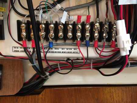 PANACHE INSTALLATION - Shown here is the completed Standard Horizon GX1700 installation. The coiled GPS cable on top of the radio allows me to extend the GPS to the cockpit. It's always nice to see a screen, tiny as it is, to navigate to a waypoint. The required DSC & channel 16 warning labels are strategically placed above the radio. The terminal strip (nickel plated) is visible just below the radio. Each connection on the terminal strip is labeled to facilitate repair. I hate having to reverse engineer one of my installations especially when labeling is so easy at installation time. My installer background! Using this hardware makes the job of navigating easier when traversing tricky shallow water, going around an island or motoring to a location over the horizon. It frees me up from the tedious task of steering so I can complete chores on board while maintaining a lookout. Later I will add an iPad Mini 4G equipped with internal GPS and mapping software as a substitute to a chart plotter. While a chart plotter doesn't give you visibility in fog or the dark it will help to keep you oriented, making it easier to deal with an issue around you. The screen resolution of an iPad is very good and it is so easy to zoom in/out with the touch screen. To make an iPad waterproof, tuck it inside an acrylic topped Pelican case. Alternatively if you use a laptop as a chart plotter, then wire the GPS NMEA data output +/- to the PC RXD data +/- input. Connect the laptop to boat battery for long term operation. Notice the tiny toggle switch on the aluminum mounting