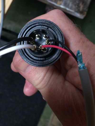 NMEA BENCH TESTING - This is the electrical connection to the Tiller Pilot for my bench testing of NMEA control. NMEA wires (BK-neg, WH-pos) on the left and DC power (BK-neg, RD-pos) on the right. The connector key is at the top. This allowed me to confirm the wiring configuration and various GPS options at home during the winter. My bench testing is now complete with the Tiller Pilot displaying the correct NMEA commands on the screen. While I'd love to say it works, I'll reserve my conclusion till Spring of 2019 when I will run it through a sea trial to confirm operation. Can't wait for that. TOP