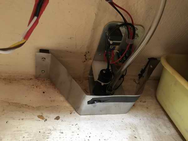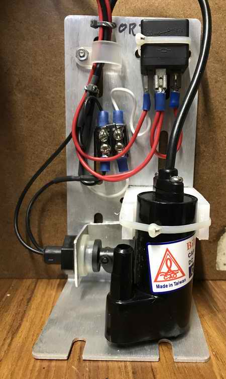 bilge pump, float switch and relay combination is installed on an aluminum base plate