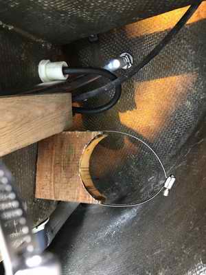 goes aft from the pump in a wood cable tray at the top of the bilge,