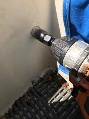 a bulkhead the wood core was sealed with epoxy, a thru hull is fitted to provide chafe protection and is sealed with butyl rubber to