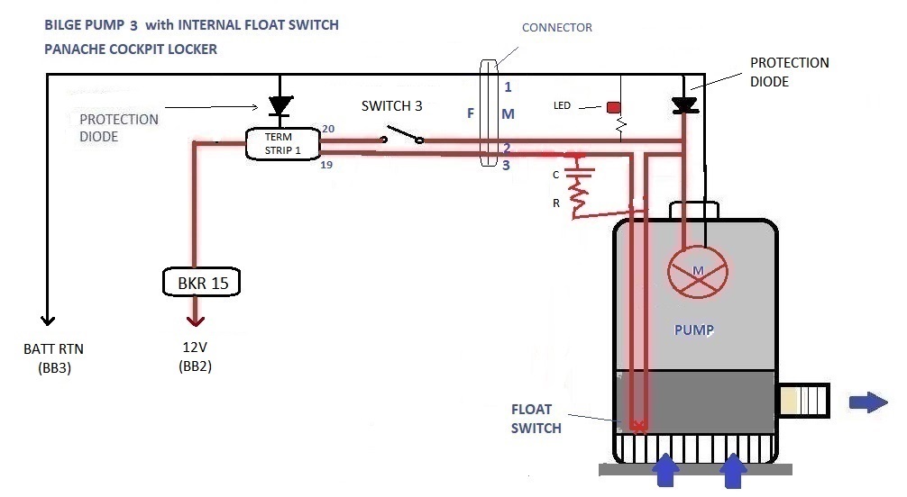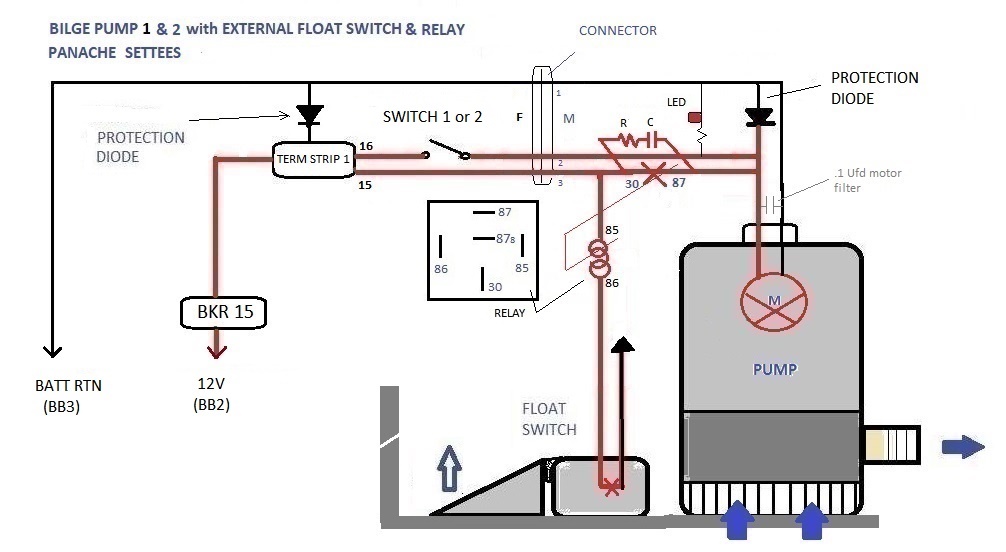 - Finally, keep the power wires away from all other boat wires to prevent the noise from coupling to adjacent wiring. These steps are generally good practices to follow for a quiet electrical wiring system so other electronics can operate. In Panache's case the bilge pump now operates quieter (electrically). Hence all the extra components. So what's the point of all this? A previous workmate and I are designing and fabricating a remote WI-FI monitoring system that requires clean power with no false signals to skew the measurements. It can measure system voltage, cabin temperature, cabin humidity and bilge pump operation. This will be documented in a separate Tech Tip E22. SETTEE BILGE FLOAT SWITCHES - For the shallow settee bilges I
