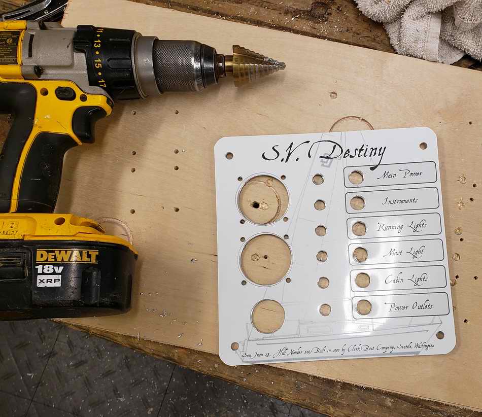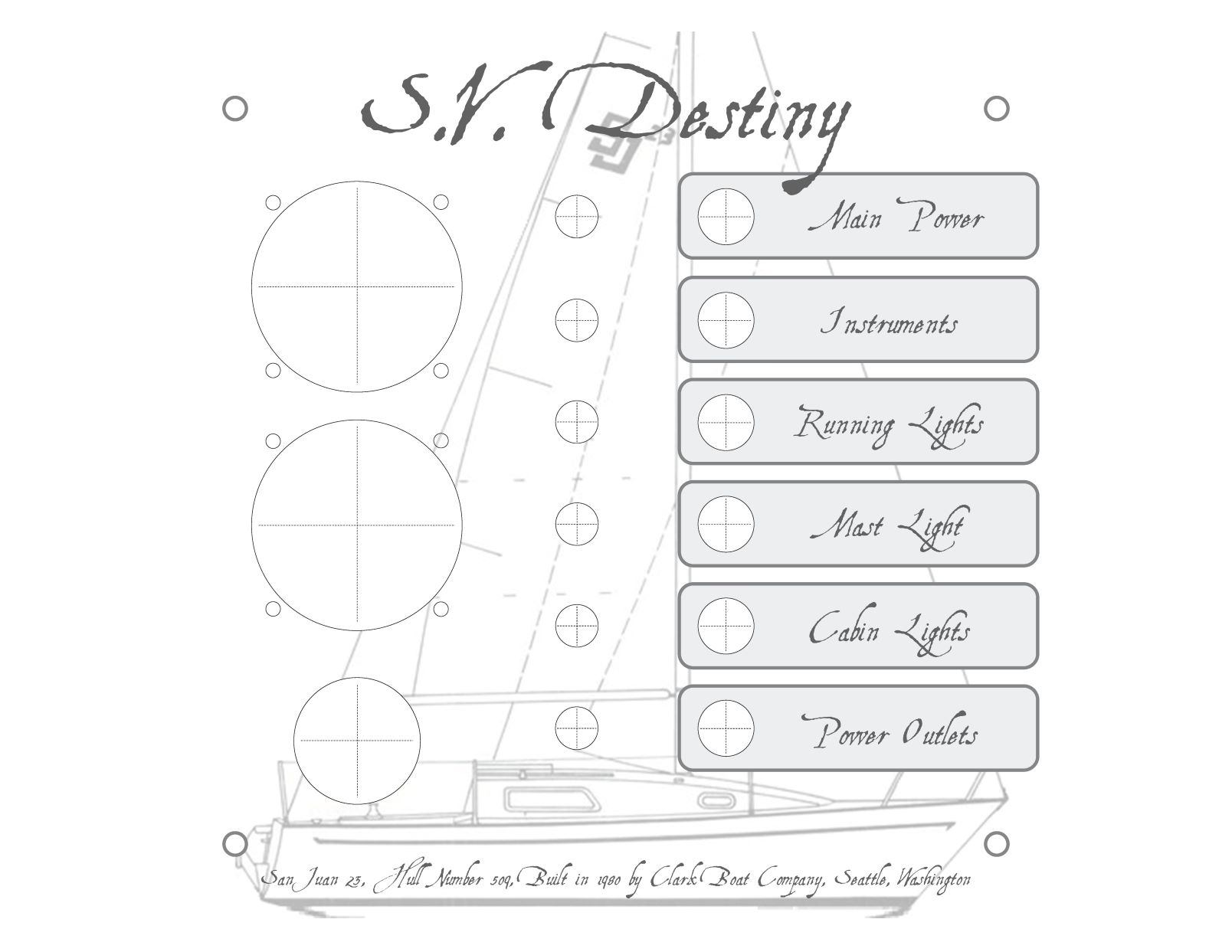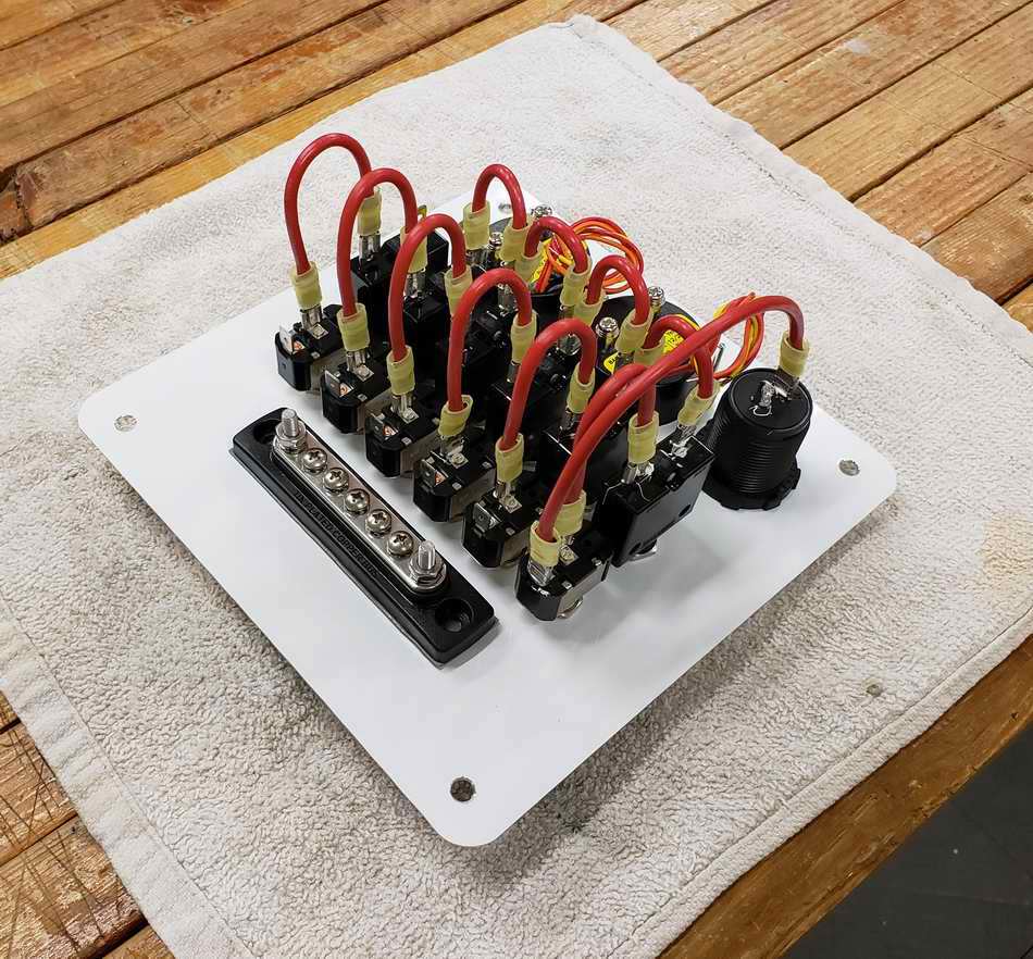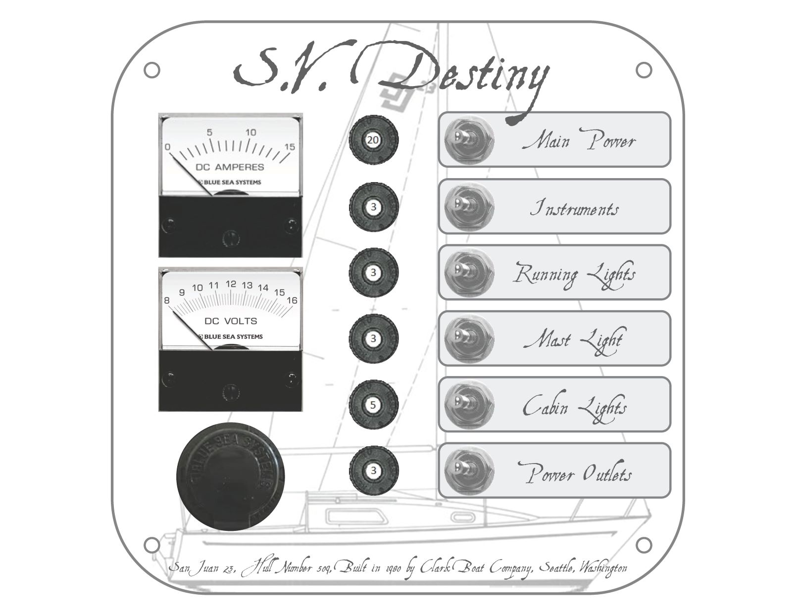 Fig 1 - The design and layout was done with Microsoft Publisher and printed on a blank aluminum panel for perfect alignment of all components. The circuit breakers, switches and gauges were all sourced from Blue Sea Systems.