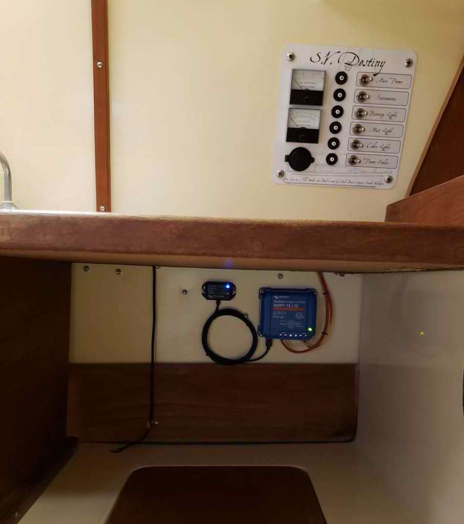 Fig 5 - The power distribution panel installed at the aft end of the port settee. The blue Victron 75/15 MMPT solar charge controller is below it, within line of sight to see the LEDs. Victron has an excellent Blue Tooth APP to monitor the performance on a smart phone. Note the red & yellow power wires that come down from the distribution panel.