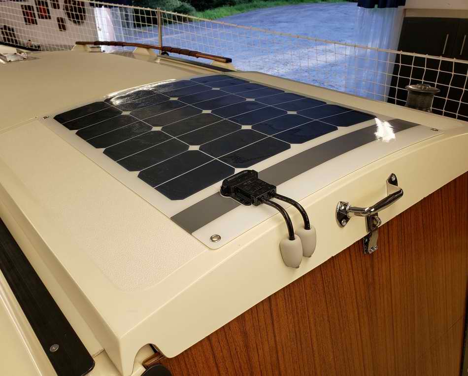 Fig 6 - All the power for Destiny comes from this Sunpower 50W flexible solar panel on the sliding hatch. It charges a 100AH battery. We can also charge the battery from the 6A generator in the outboard, but have never plugged it in. Our power needs are so minimal, 2A at best, that the single solar panel is more than adequate. There is no shore power connection for a 110VAC battery charger.