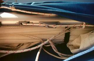 the goose neck cap to secure this line). The other static line exits at the free end of the boom. (Remove
