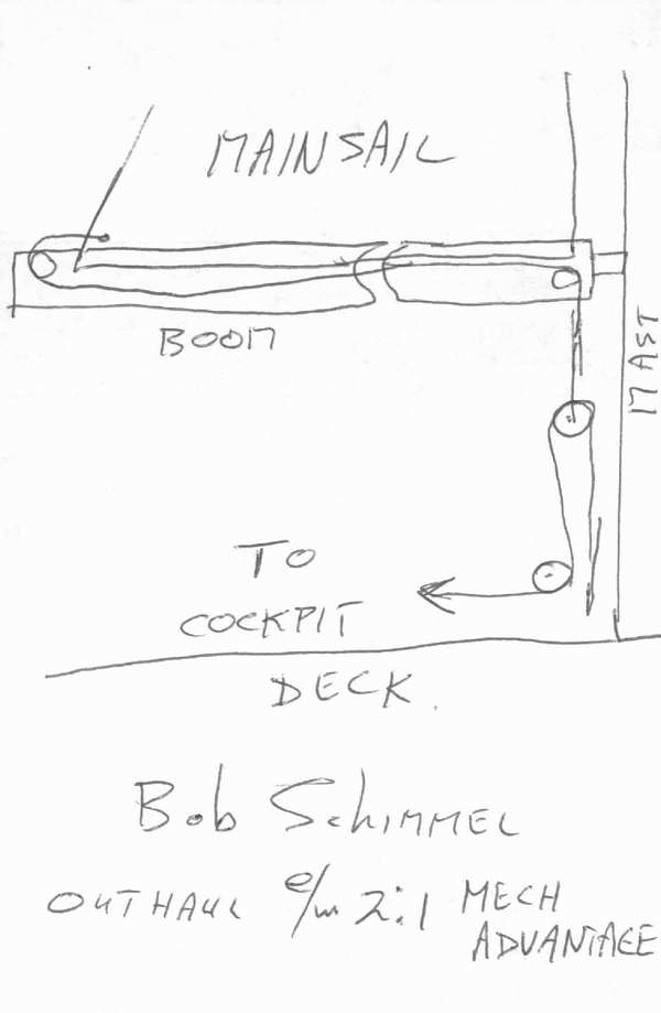 My initial outhaul design was a simple 2:1 block & tackle that lead aft to the cockpit. But not having space on the deck to terminate the line I chose a 4:1 block and tackle that exits at mid boom as shown at right.