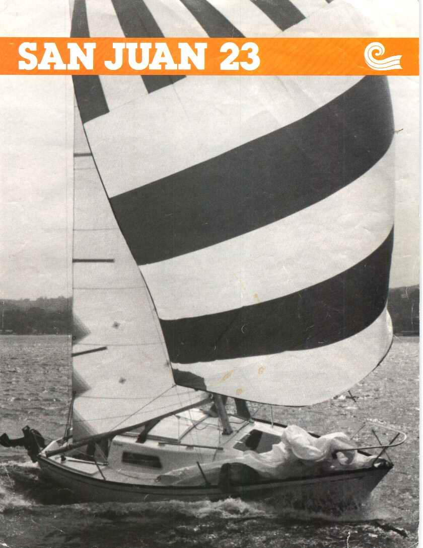 1977 brochure showing an SJ23 on a spinnaker run. This boom would sweep clear across