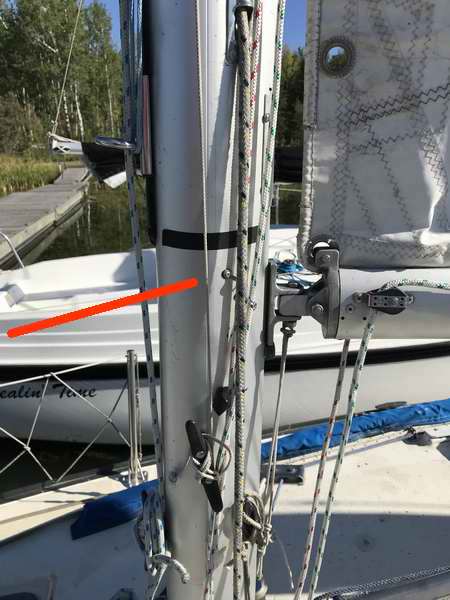 on the mast, a few inches below the bottom of the boom. This intersects the strain at about