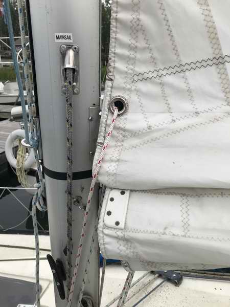 at the eye strap on the mast with a shackle. It then goes through the mainsail cringles