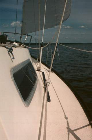 NOTE: "There are limits to increasing boat speed or arriving at your upwind destination sooner by pointing higher. A high performance keel boat can do this for one reason only, keel shape. The deep keel is a foil that generates lift as it "pulls" through the water. Total lift is a squared function of forward speed: double the speed, quadruple the lift. An SJ24 keel is much more efficient upwind with its high aspect ratio deep keel. However, the SJ23 has a keel stub so it can be easily trailer launched. The trick to getting the most pointing performance out of the SJ23 is to drive the boat hard to maintain speed through the water, which allows the keel stub to generate more lift, which leads to less leeway. You can aim the boat as high as you want and sheet the beejeezus out of the jib, but on the SJ23 with the stumpy keel, compounded with the flat centerboard, the underwater foil just stalls, lift goes in the toilet and the boat ends up going sideways (leeward). I sheet my working jib to the rail, lead from about the shrouds. For Genoa sheeting, I trim it so the leach is about a foot or more off the spreaders. For comparison, I trim an SJ24 jib to 2 to 4" off the spreader. The goal here is to drive the boat hard with an open slot to let the sail plan breathe, not stall the keel and minimize leeway. In addition, the SJ23 has relatively little rocker and sailing lower and fast means you don't pound into head seas, which can stop an SJ23 dead. When in doubt, foot off. If you have speed through the water you have way more control options to make something happen." Glen Moore. You can determine the optimum sheet angle by drawing a straight line from the middle of the luff, through the clew to the deck, allowing for the height of the block. This position is usually good for mid range winds for the particular jib. Since you now have a "middle point" for the track you simply have to allow for about a foot fore and aft for lighter or stronger winds. Remember to allow for the height of the block when positioning the track. Do this for each of your jibs and you will quickly determine the position and overall length of the track. The SJ23 manual, Tech Tip H08 (Sail Setting Guide), also has suggestions on where to place the sheet block for the optimum angle. At one time Panache's deck track was equipped with a Merriman doublewide block, so it was possible to set a new jib sheet on the go without releasing tension on the working jib. This is great for swapping a hanked on jib on the go. Coincidentally, a single sheet slides easier through the double block. If you install a single block on the track then use a spring under it to keep it standing. This keeps it from flopping against the gel coat, which is also quieter when sailing in the "doldrums", and keeping it standing means the sheet will run easier through it.